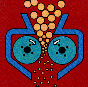 利用輥面的摩擦力將物料咬入破碎區,使之承受擠壓或劈裂而破碎的機械。當用于粗碎或需要增大破碎比時,常在輥面上做出牙齒或溝槽以增大劈裂作用。在進料不能破碎的物料時,比如金屬物,輥子間的間隙會自動變大,因為由彈簧在后面頂住,硬物破碎不了會把彈簧頂開,輥子會向后移動。