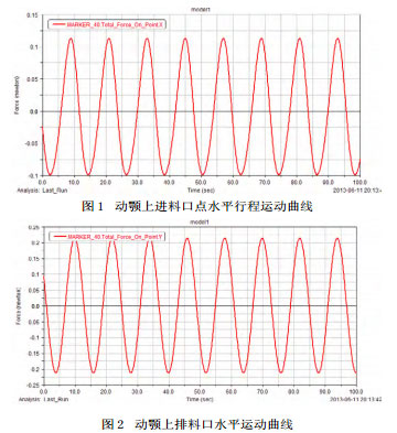 圖1 動顎上進料口點水平行程運動曲線圖2 動顎上排料口水平運動曲線從破碎機進料口點的水平位移曲線( 如上圖 1 所示 )、垂直位移曲線(省略)均可以看出這點的平均較大水平行程距離大約為3.5 cm;從出料口C 點的水平曲線圖(如圖 2 表示)、垂直位移曲線(由圖表表示)都可得出 C 點的平均較大水平行程大約2.5cm,其中平均較大垂直行程約為4 cm。顎式破碎機動顎板的平均水平行程較原來更大,確保動顎板對物料施加相當大的擠壓力,并且破碎腔從上到下的水平行程是遞減的,確保排料通暢。而且從上述圖表可以看出動顎垂直行程相對比較小,從而減少了過粉碎和磨損,既有利于破碎過程也有利于排料過程,并且破碎效果良好。
